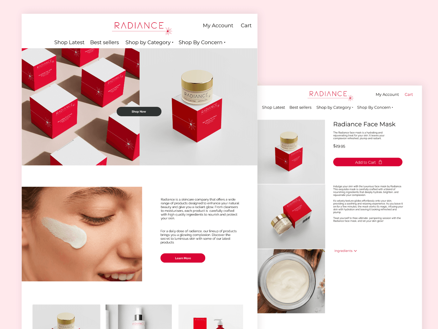 Brand and packaging design for Radiance, a skincare concept focused on creating a clean, considered aesthetic across both product and web — from label to landing page.