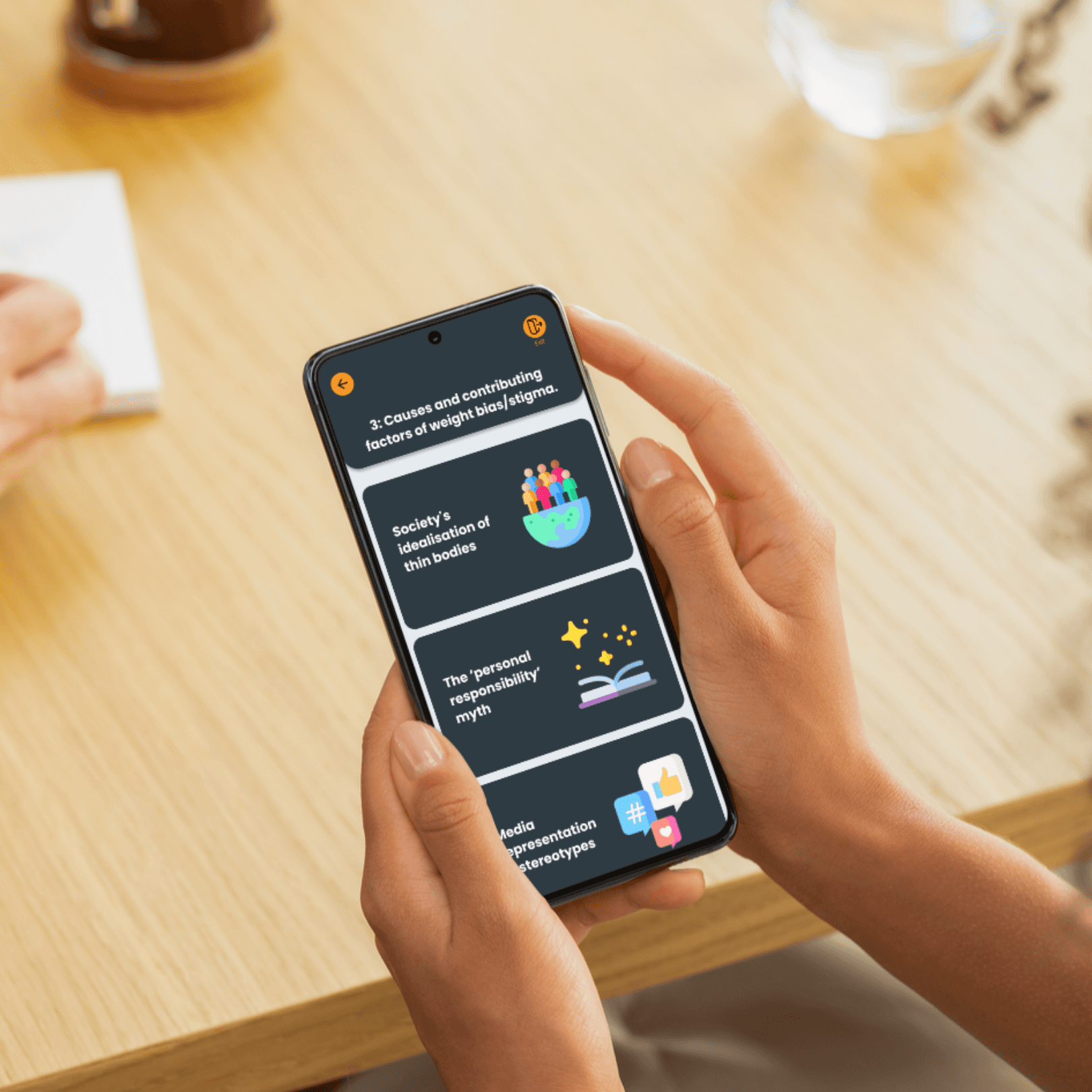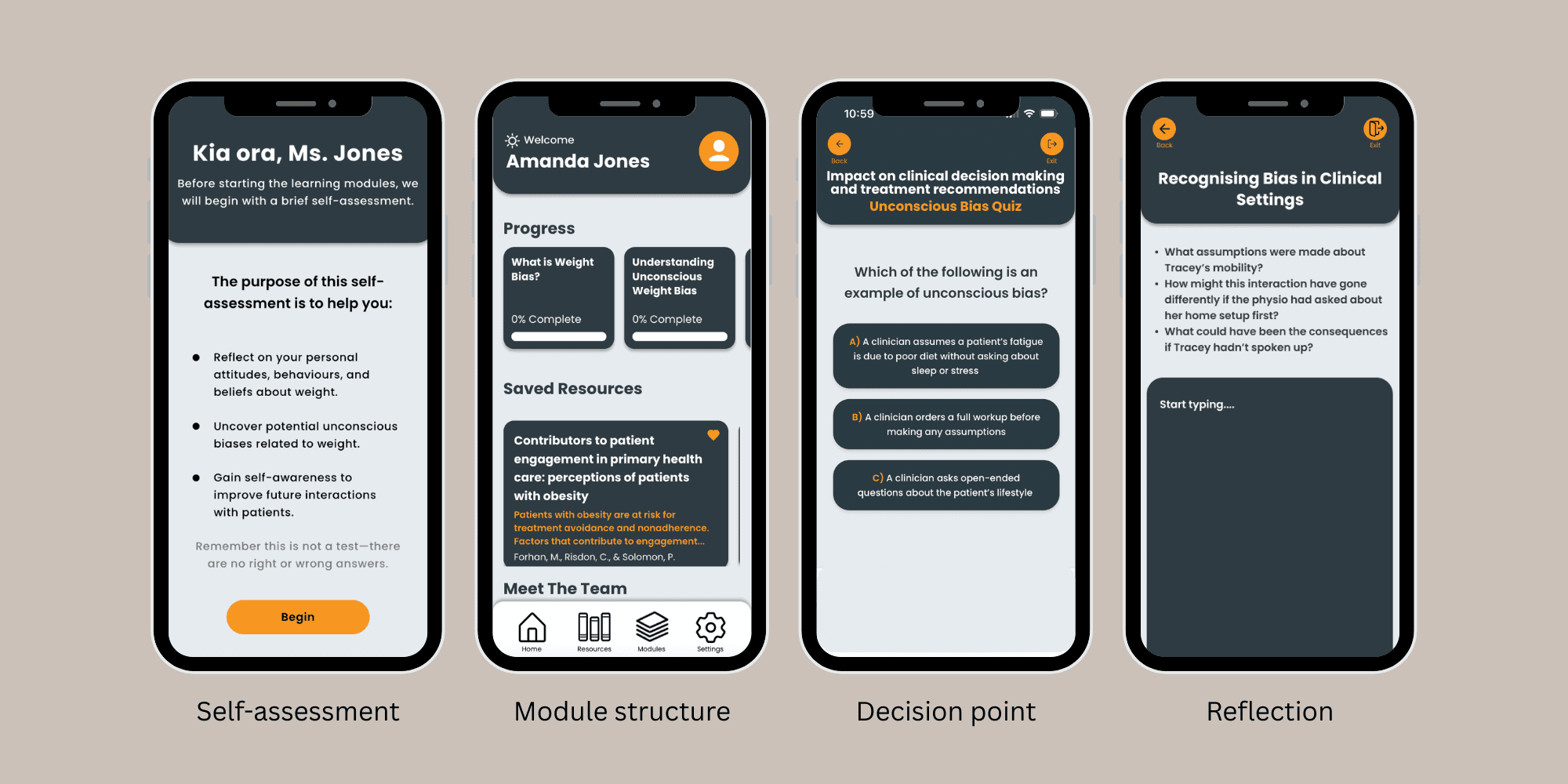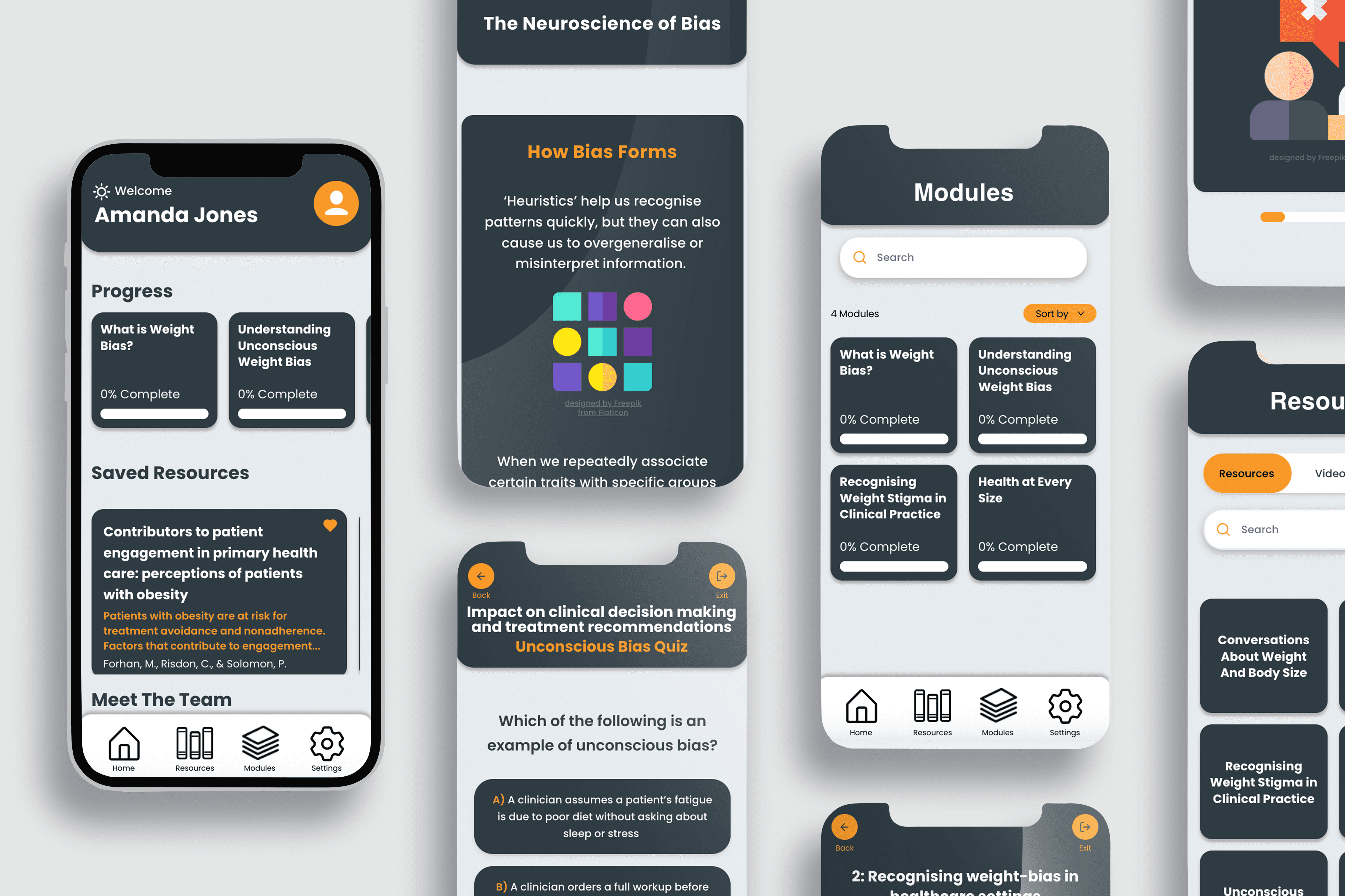 The platform is organised into modules, each targeting a different dimension of weight bias, from clinical communication to the physical environment of care. Within each module, scenario-based interactions move practitioners through moments of decision and reflection rather than passive content consumption.