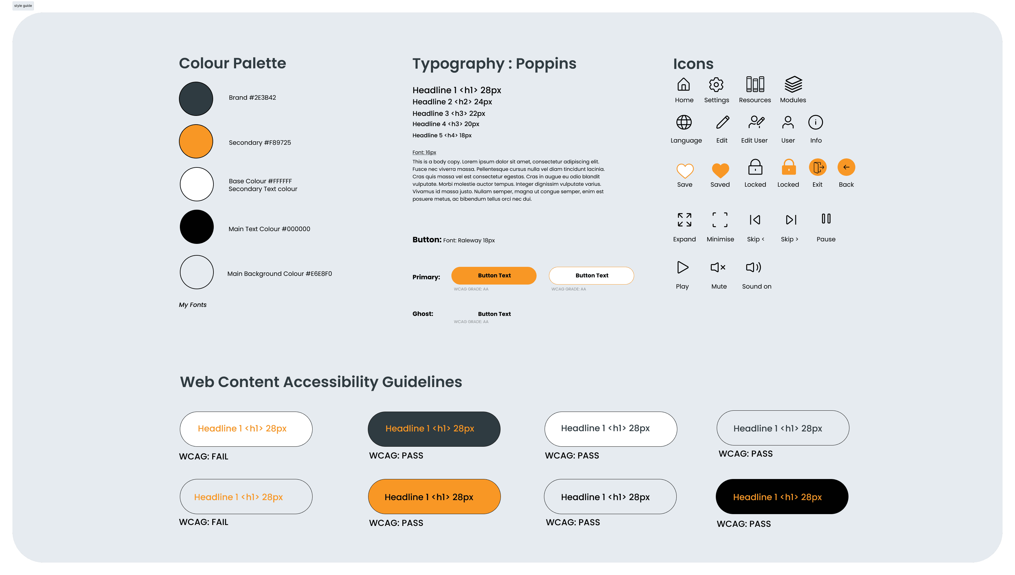 The visual identity draws from Essential Helpcare's existing colour palette, situating the platform within their broader suite of resources. The palette pairs a deep blue with a bold orange accent against a light neutral background, tones that feel professional and clear without being clinical or cold. The contrast between the two works functionally as well as aesthetically, with the orange carrying interactive elements and calls to action while the navy anchors the brand. All colour combinations were tested against WCAG accessibility standards to ensure the platform remained inclusive, particularly important for a product addressing equity in healthcare.